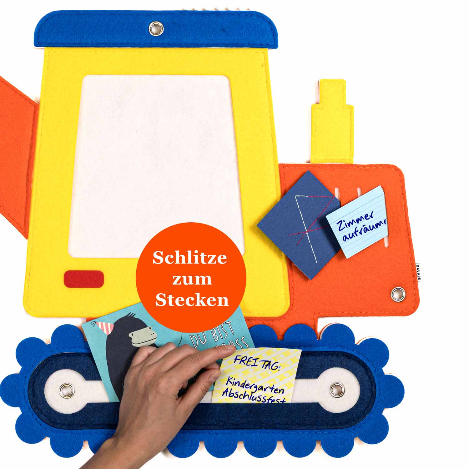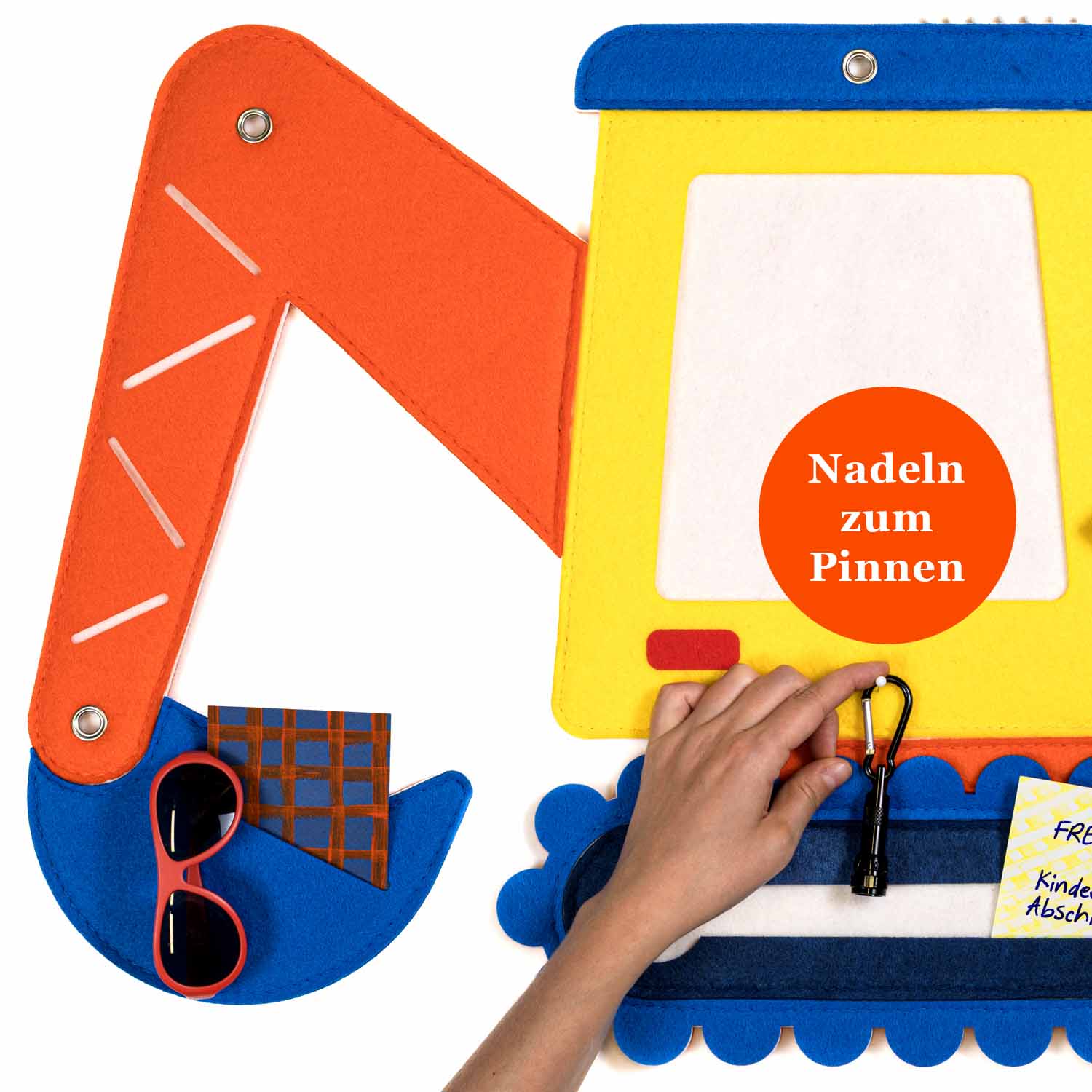 Das BAGGER-Visionboard eignet sich außerdem hervorragend, um vorübergehend Gegenstände, die noch keinen festen Platz haben aufzubewahren, wie z.B. Freundschaftsbändchen, Sticker, Ausmalbilder oder wichtige Wochen-ToDos. Die Schlitze laden zum Einschieben ein und mit den Nadeln kannst du zusätzliche Zettelchen anpinnen.