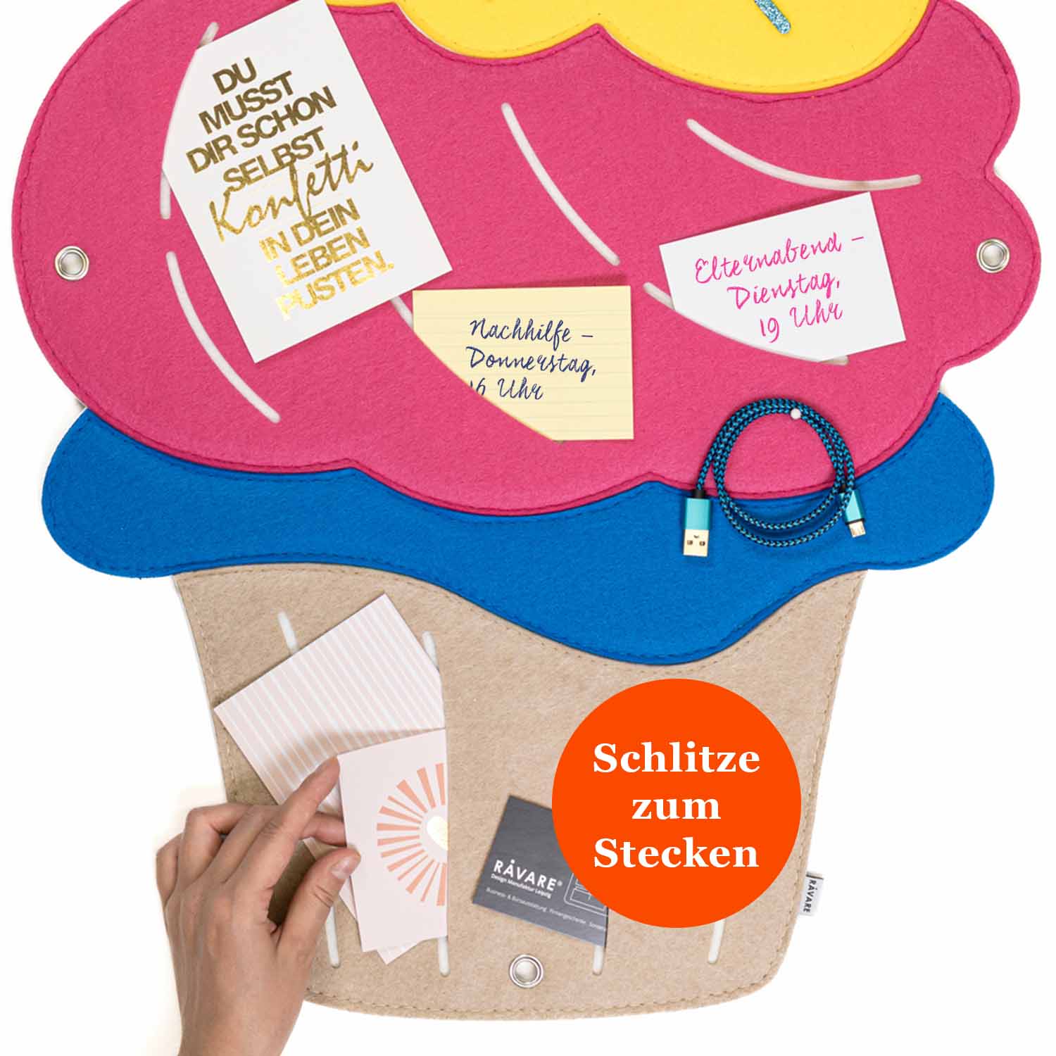 Das CUPCAKE-Visionboard eignet sich außerdem hervorragend, um vorübergehend Gegenstände, die noch keinen festen Platz haben aufzubewahren, wie z.B. Freundschaftsbändchen, Sticker, Ausmalbilder oder wichtige Wochen-ToDos. Die Schlitze laden zum Einschieben ein und mit den Nadeln kannst du zusätzliche Zettelchen anpinnen.