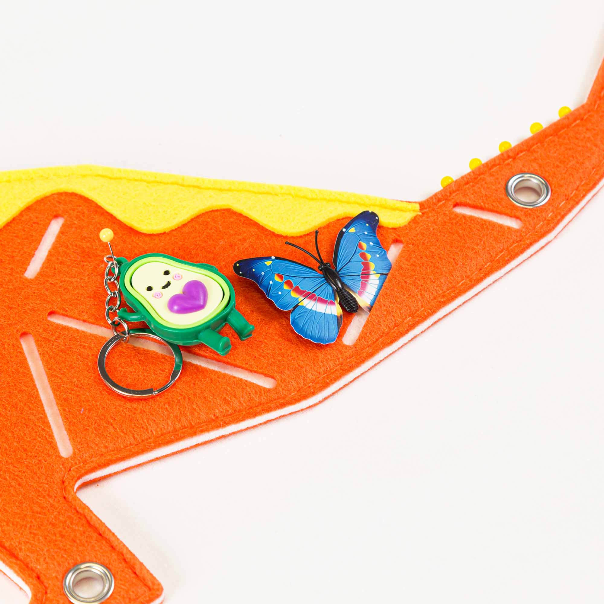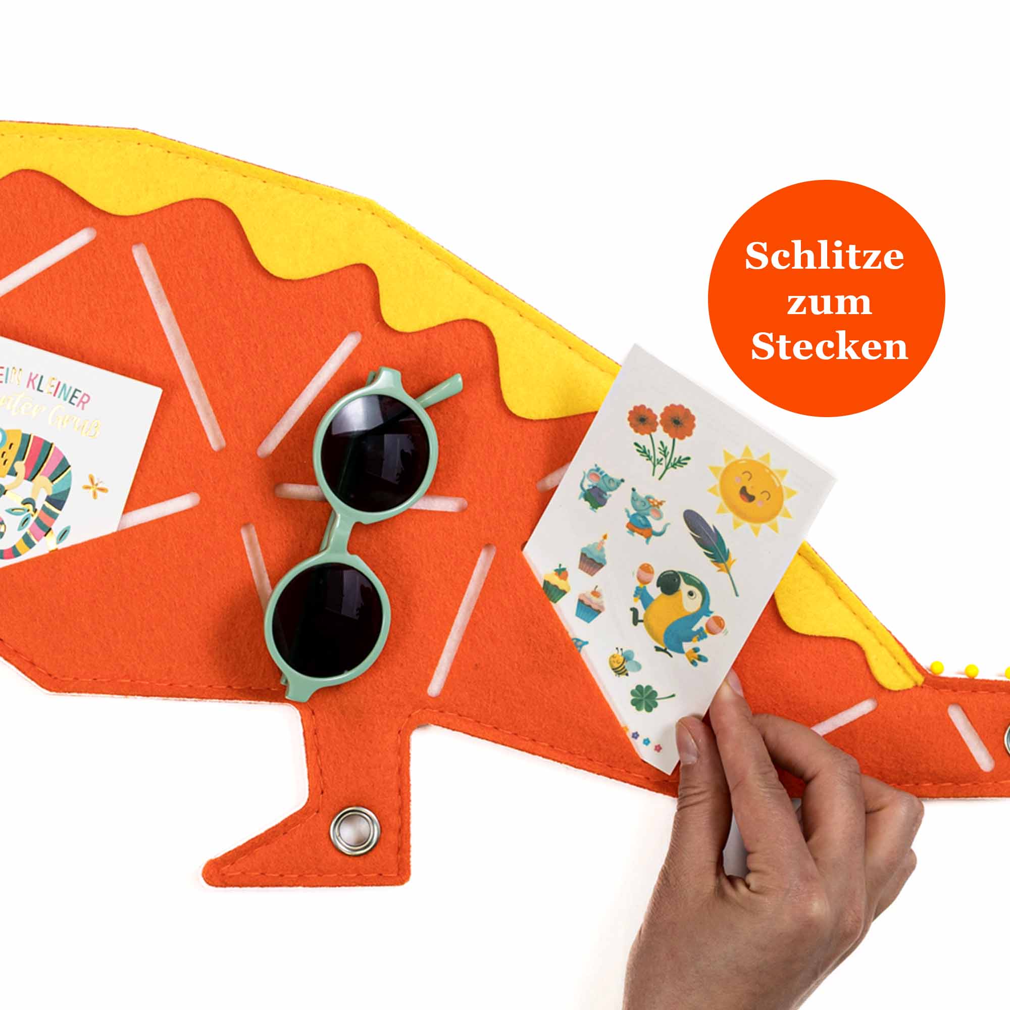 Das Dino-Visionboard eignet sich außerdem hervorragend, um vorübergehend Gegenstände, die noch keinen festen Platz haben aufzubewahren, wie z.B. Freundschaftsbändchen, Sticker, Ausmalbilder oder wichtige Wochen-ToDos. Die Schlitze laden zum Einschieben ein und mit den Nadeln kannst du zusätzliche Zettelchen anpinnen.