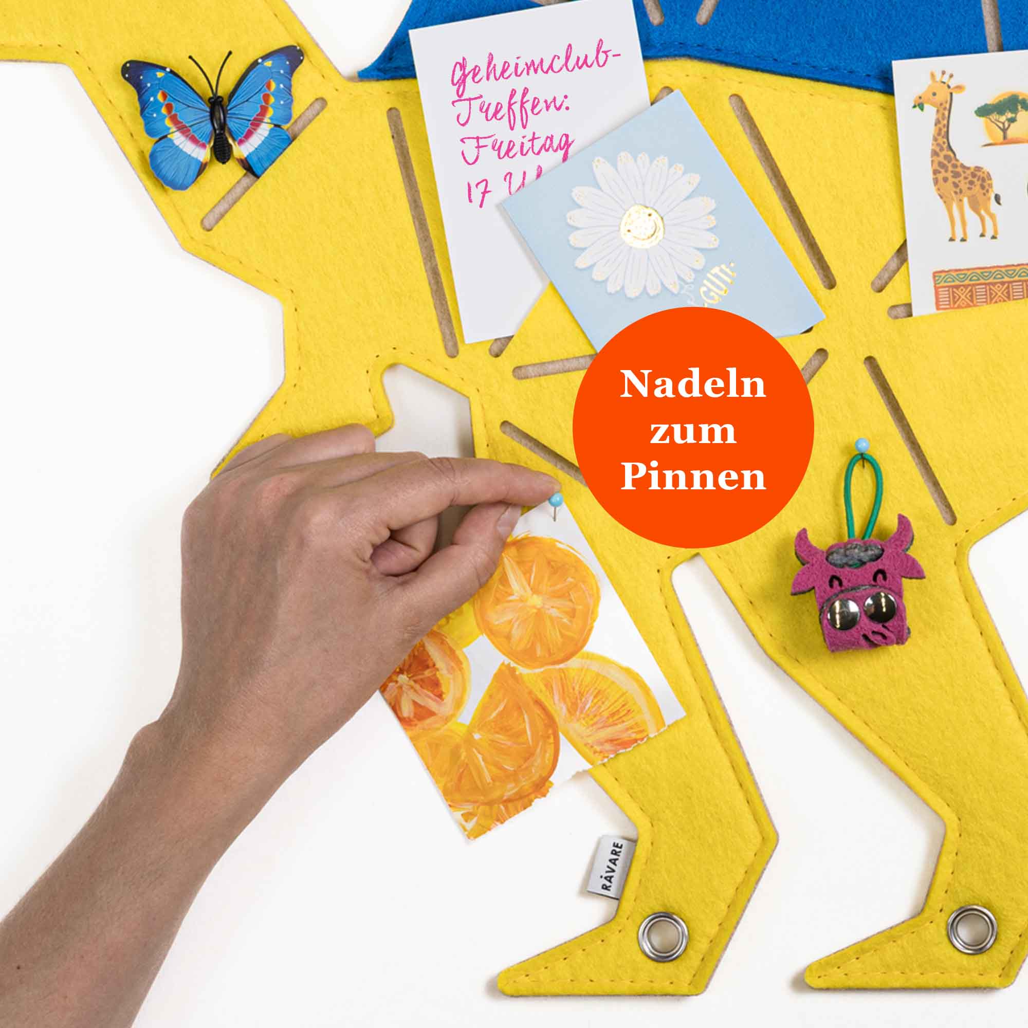 Das Dino-Visionboard eignet sich außerdem hervorragend, um vorübergehend Gegenstände, die noch keinen festen Platz haben aufzubewahren, wie z.B. Freundschaftsbändchen, Sticker, Ausmalbilder oder wichtige Wochen-ToDos. Die Schlitze laden zum Einschieben ein und mit den Nadeln kannst du zusätzliche Zettelchen anpinnen.