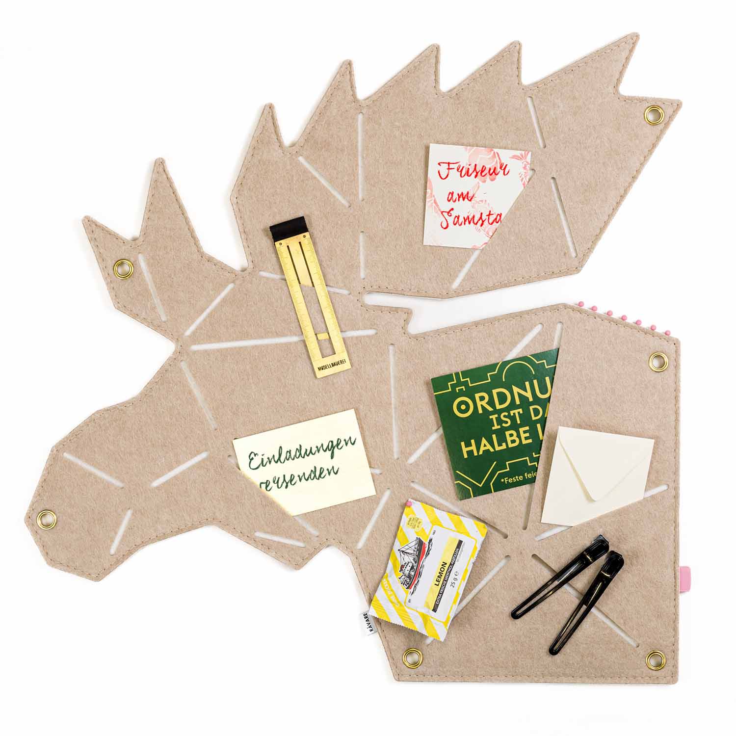 Das tierische Visionboard eignet sich außerdem hervorragend, um temporäre Gegenstände oder Dinge, die noch keinen festen Platz haben zu bündeln, wie z.B. Rabattcodes, Festivalbändchen, Schlüssel, Kosmetikproben, Schultermine oder wichtige Wochen-ToDos. Die Schlitze laden zum Einschieben ein und mit den Nadeln kannst du zusätzliche Zettelchen anpinnen.