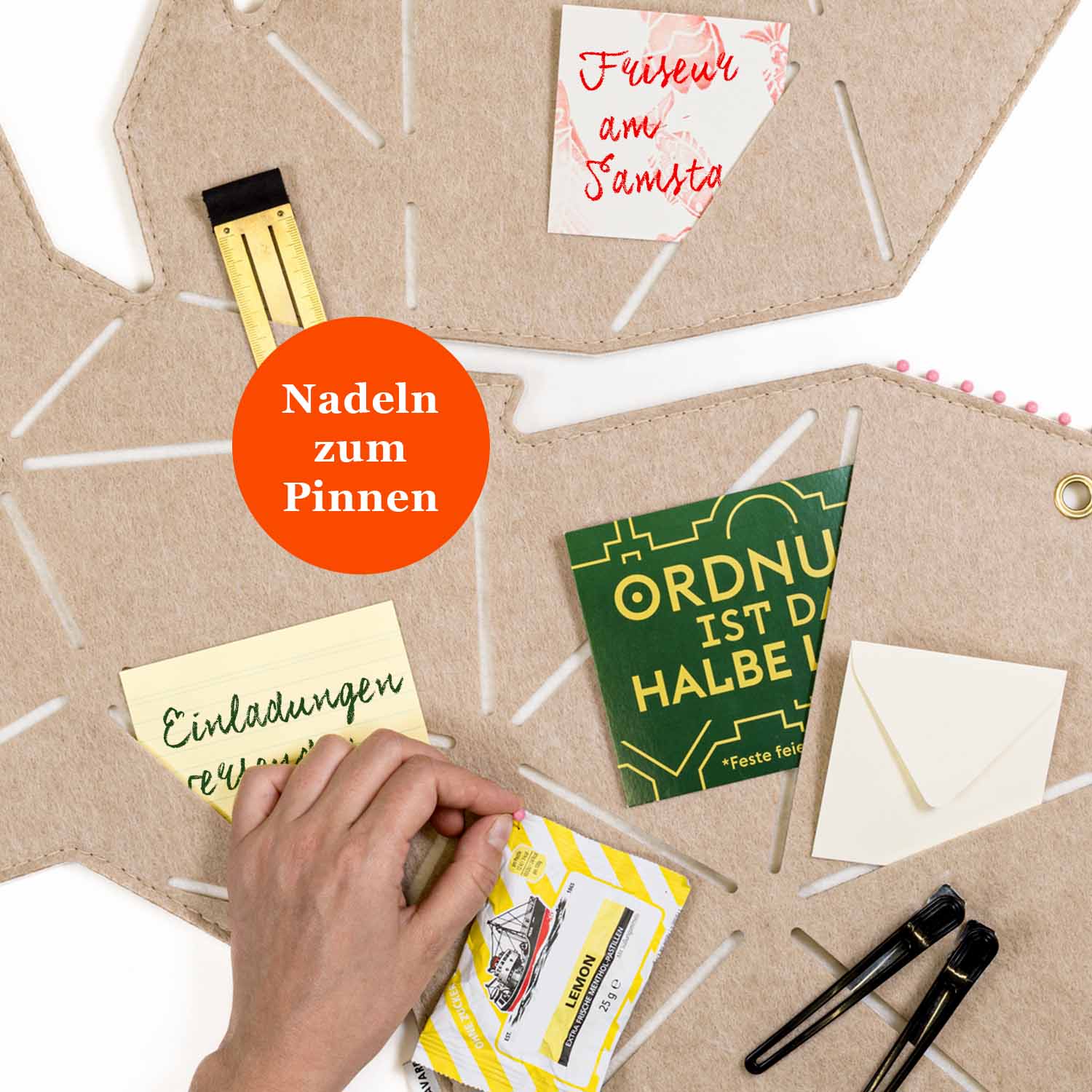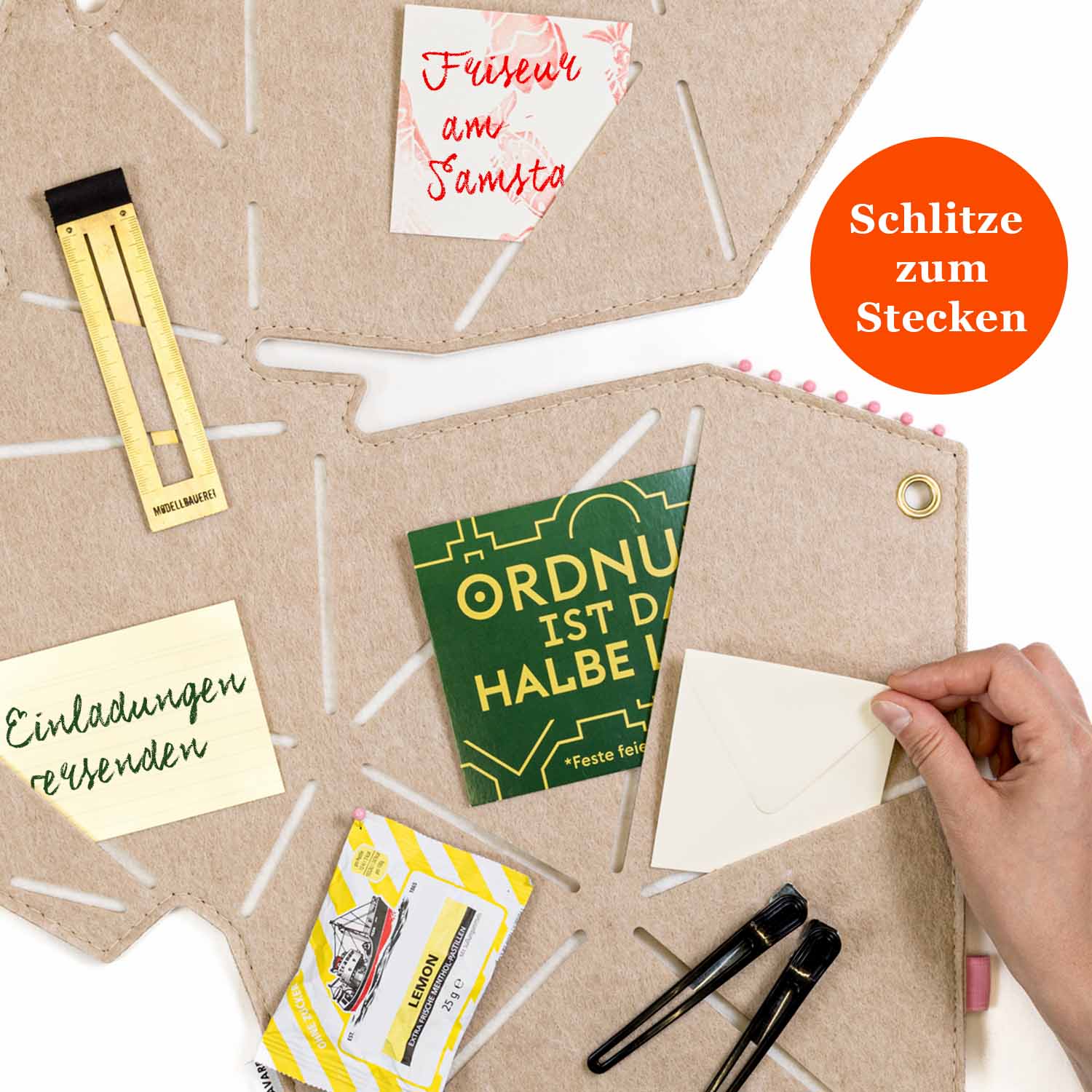 In die Schlitze lassen sich kleine Dinge wie Gutscheine, Einladungen oder Zettel einfach einschieben, während Nadeln zusätzlichen Halt für Kosmetikproben, Schultermine oder wichtige Wochen-ToDos geben.