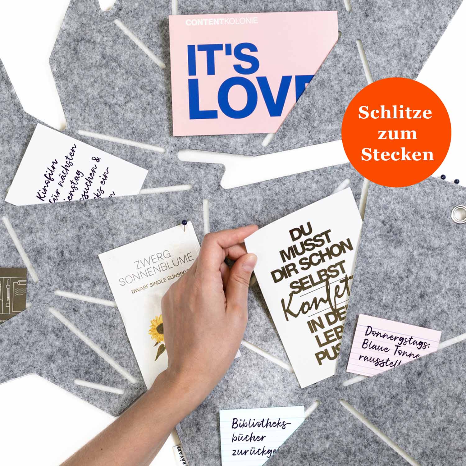 In die Schlitze lassen sich kleine Dinge wie Gutscheine, Einladungen oder Zettel einfach einschieben, während Nadeln zusätzlichen Halt für Kosmetikproben, Schultermine oder wichtige Wochen-ToDos geben.
