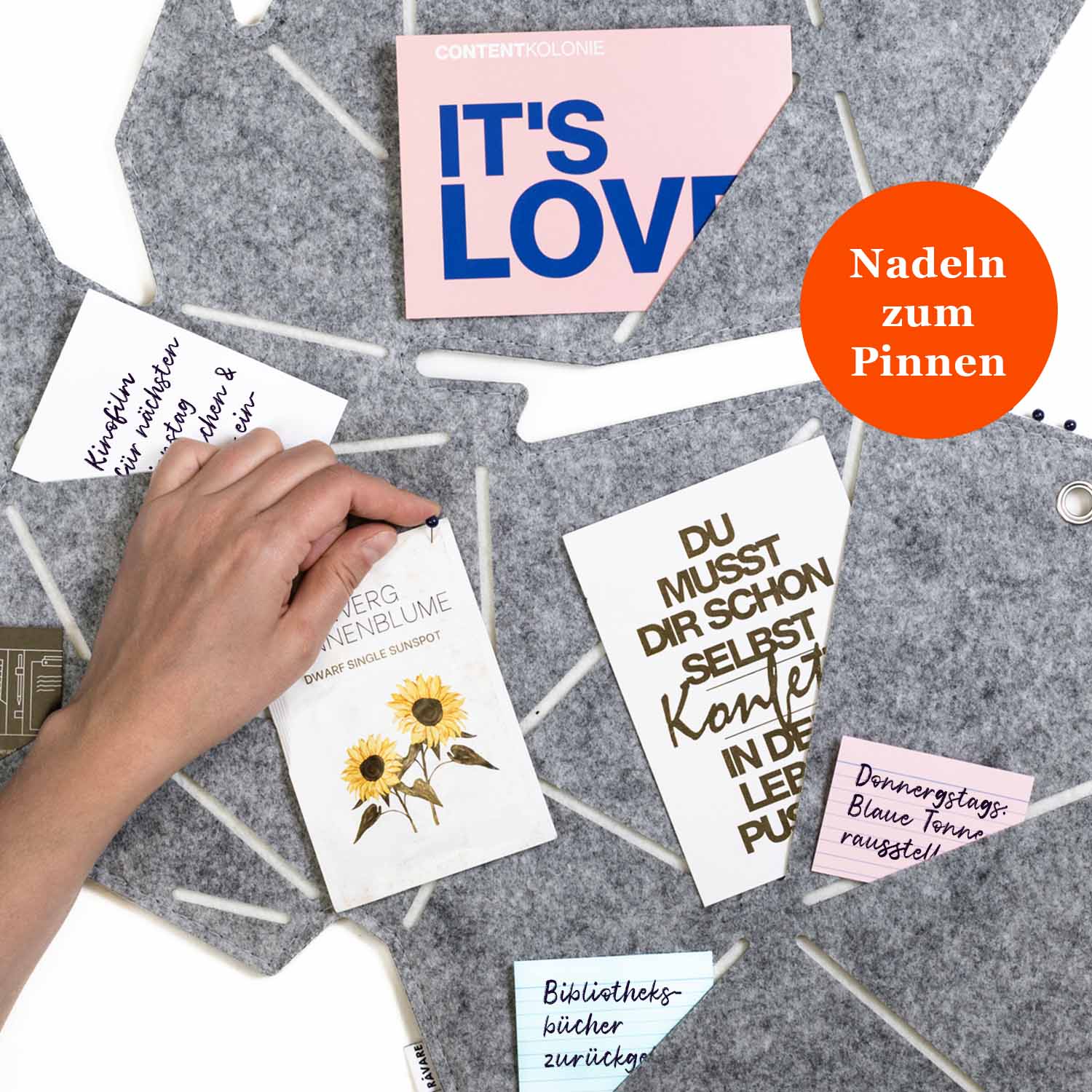 Unsere Pinnwände vereinen cleveres Anpinnen und praktisches Einschieben, sodass deine Notizen, Fotos und Karten immer sichtbar bleiben.