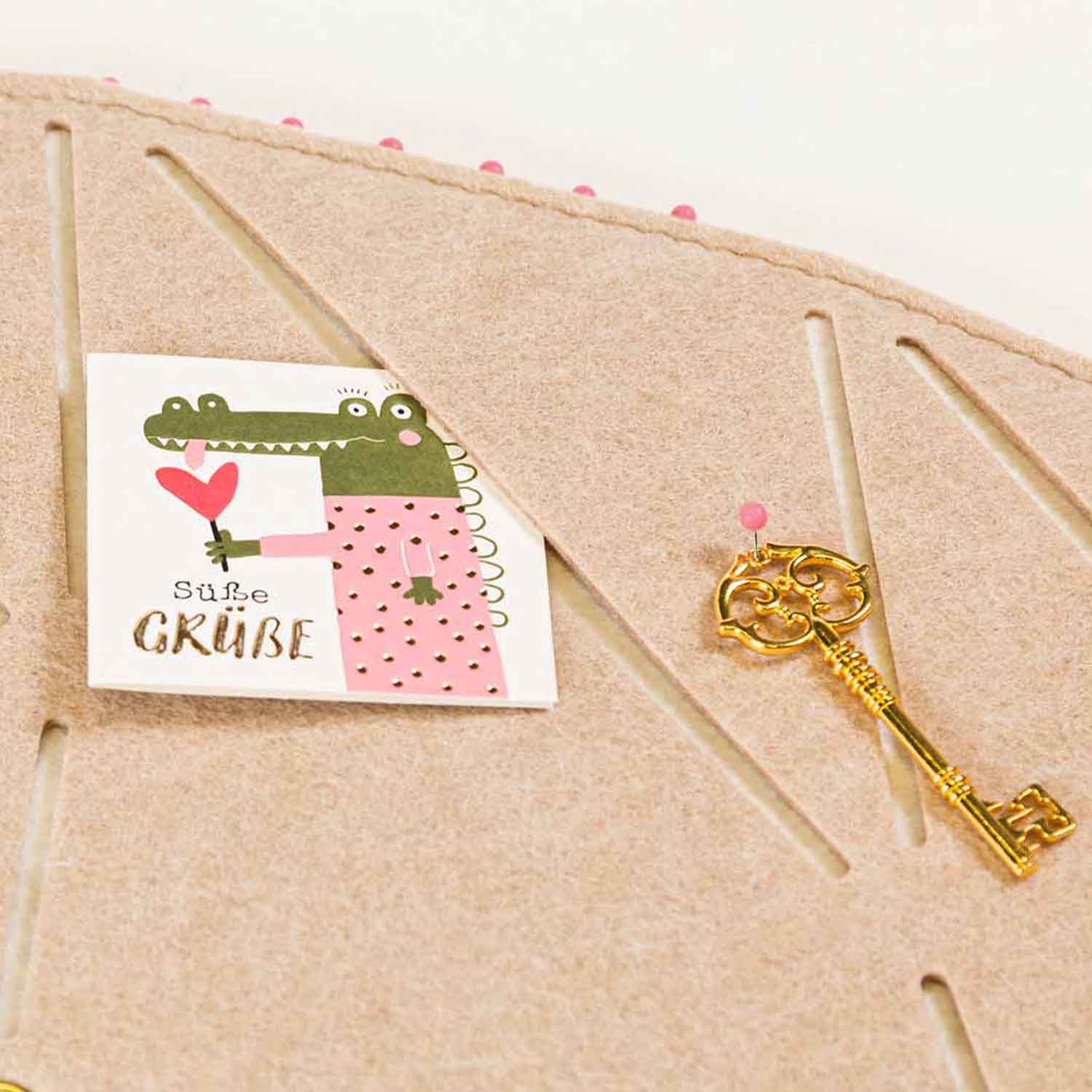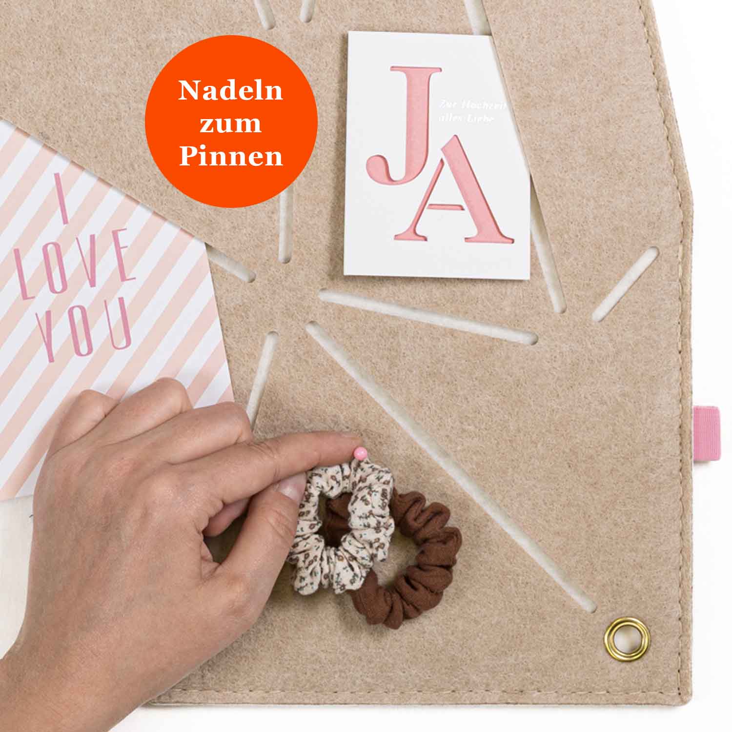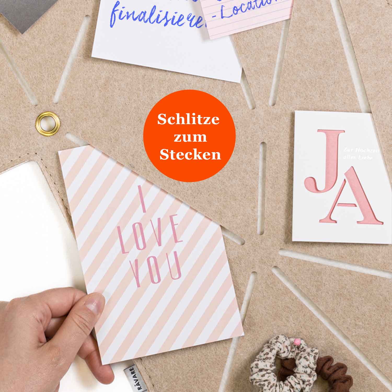 In die Schlitze lassen sich kleine Dinge wie Gutscheine, Einladungen oder Zettel einfach einschieben, während Nadeln zusätzlichen Halt für Kosmetikproben, Schultermine oder wichtige Wochen-ToDos geben.