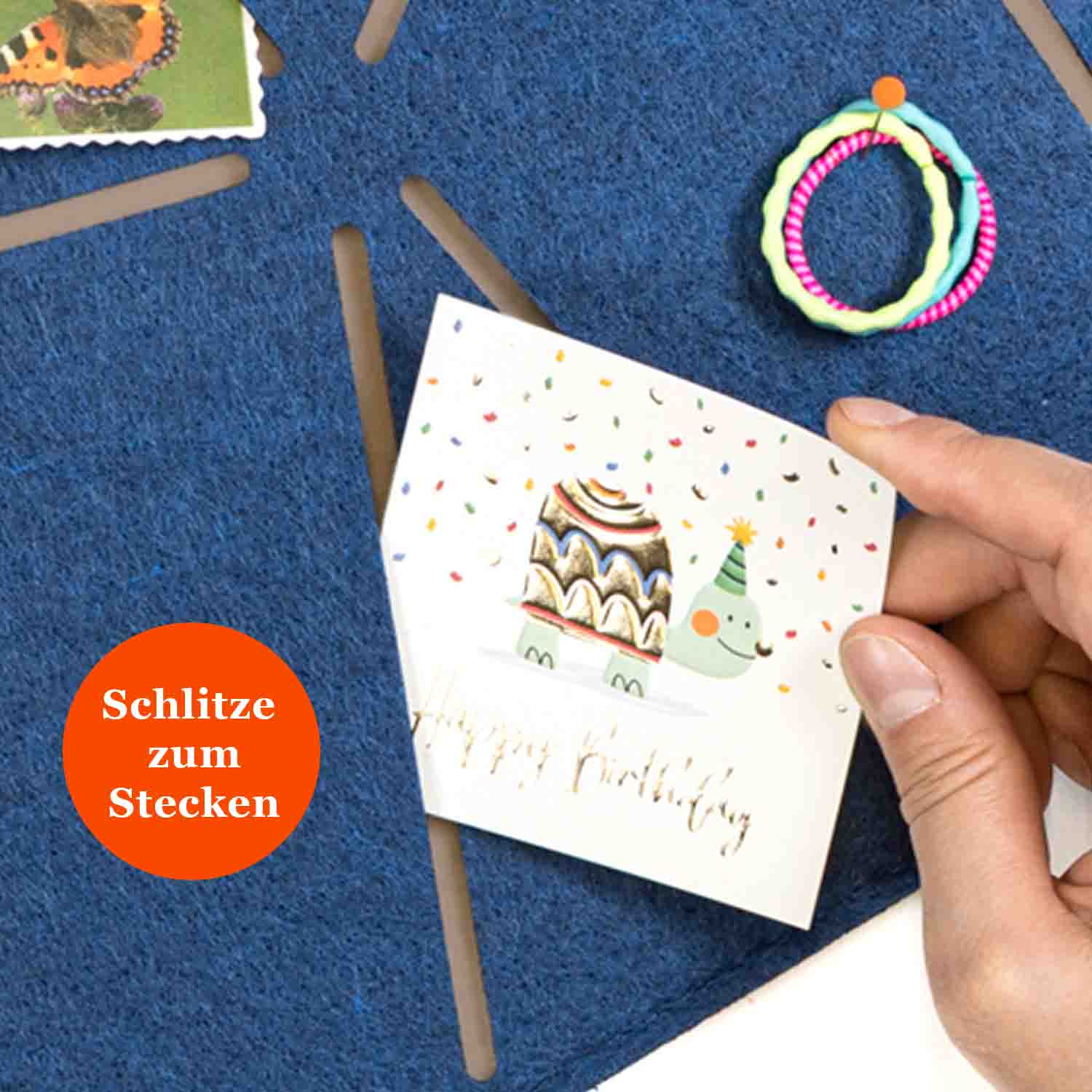 In die Schlitze lassen sich kleine Dinge wie Gutscheine, Einladungen oder Zettel einfach einschieben, während Nadeln zusätzlichen Halt für Kosmetikproben, Schultermine oder wichtige Wochen-ToDos geben.