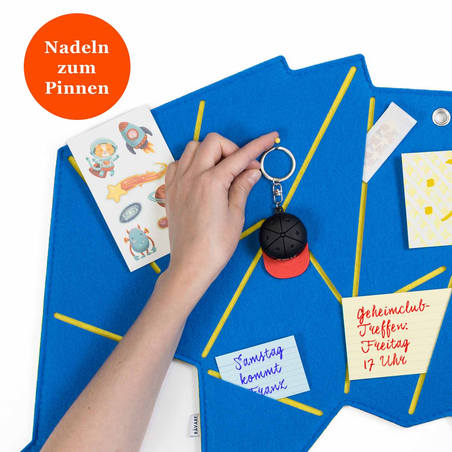 In die Schlitze lassen sich kleine Dinge wie Gutscheine, Einladungen oder Zettel einfach einschieben, während Nadeln zusätzlichen Halt für Kosmetikproben, Schultermine oder wichtige Wochen-ToDos geben.