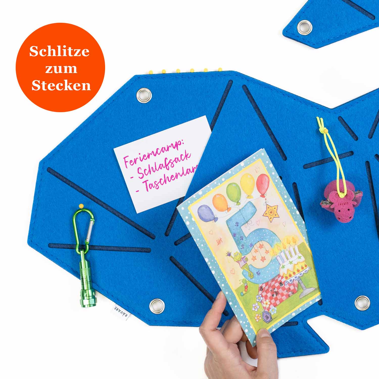Mit unserer fischförmigen Tier-Pinnwand WAL kannst du deine wichtigen ToDos im Schulalltag organisieren: Termine für die Schule anpinnen, kleine Liebesbotschaften einschieben, nette Einladungen sichtbar feststecken uvm. Mit deinem Memoboard hast du so deine Postkarten, Notizen und Fotos immer sichtbar und griffbereit.