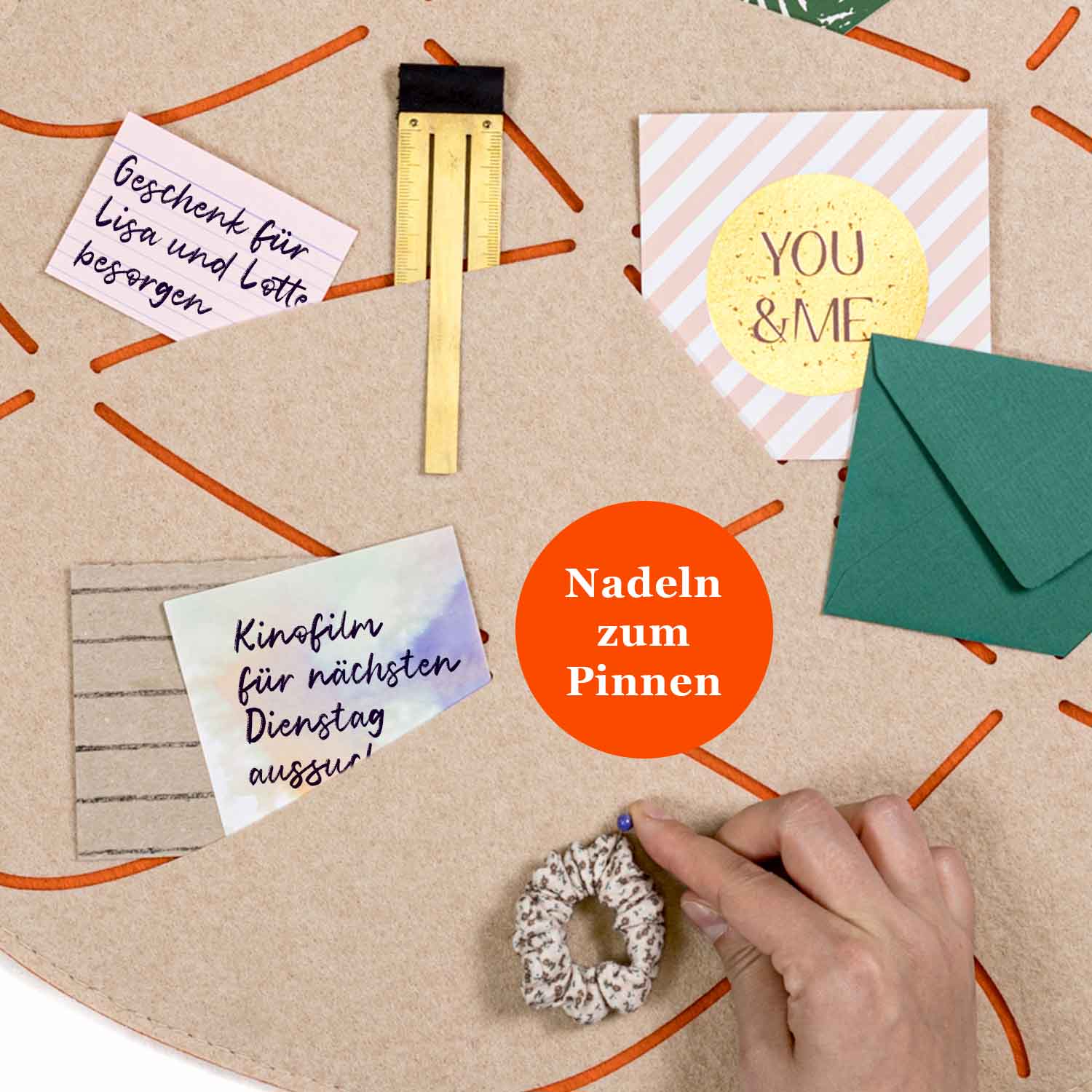 In die Schlitze lassen sich kleine Dinge wie Gutscheine, Einladungen oder Zettel einfach einschieben, während Nadeln zusätzlichen Halt für Kosmetikproben, Schultermine oder wichtige Wochen-ToDos geben.