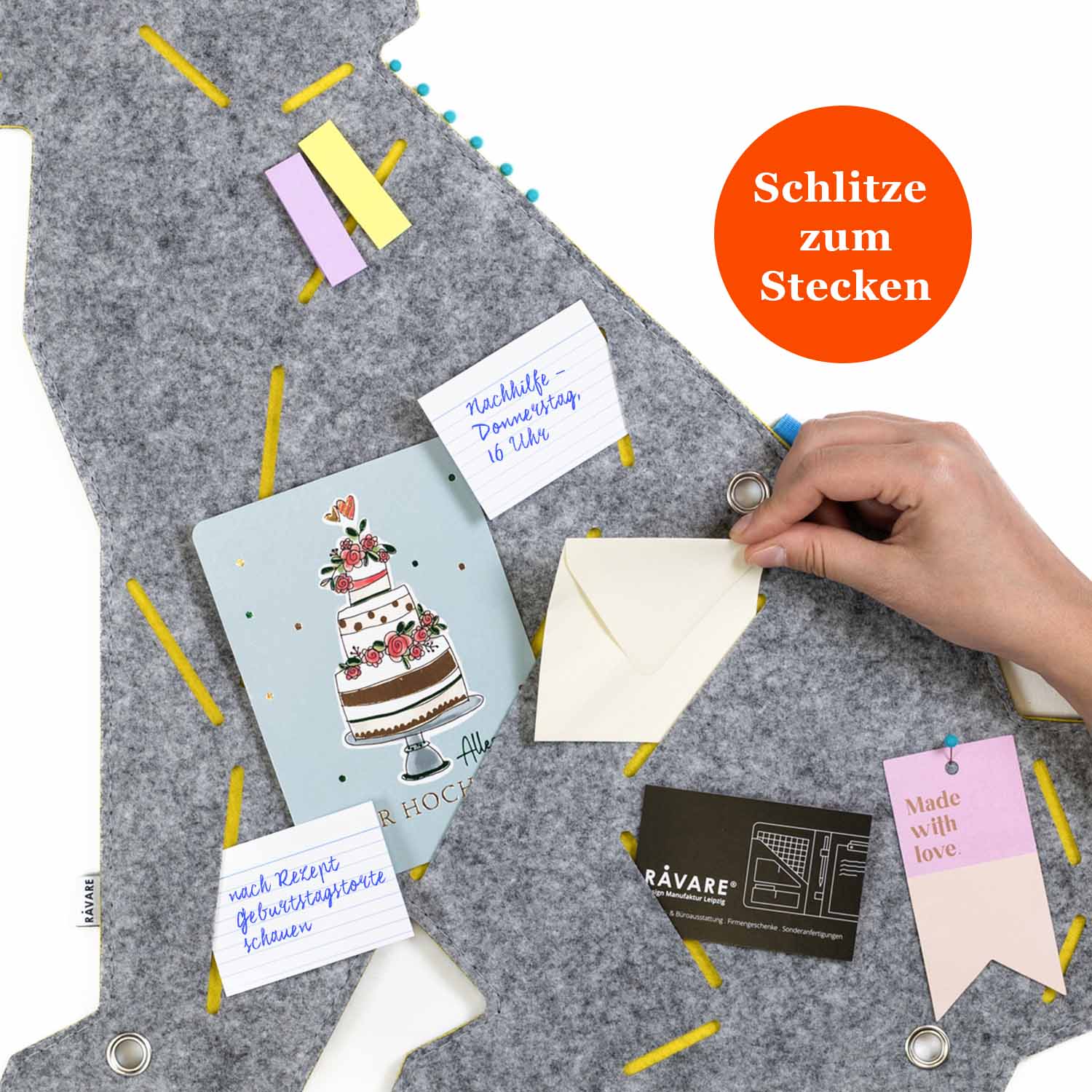 In die Schlitze lassen sich kleine Dinge wie Gutscheine, Einladungen oder Zettel einfach einschieben, während Nadeln zusätzlichen Halt für Kosmetikproben, Schultermine oder wichtige Wochen-ToDos geben.