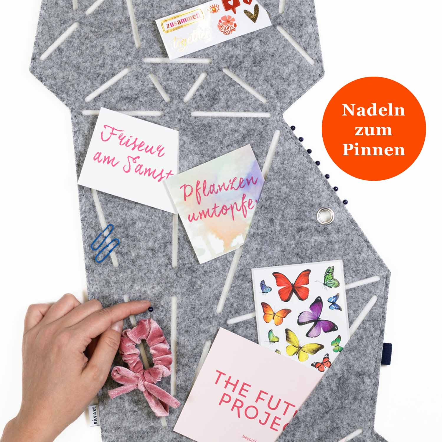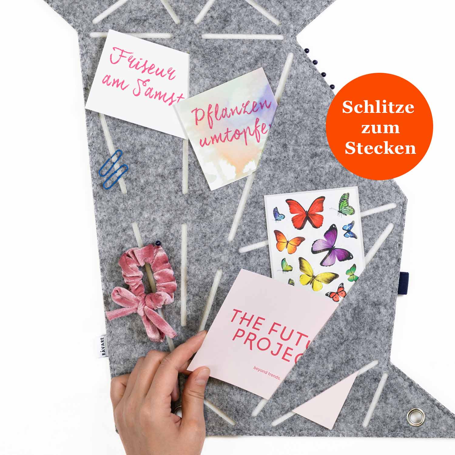 In die Schlitze lassen sich kleine Dinge wie Gutscheine, Einladungen oder Zettel einfach einschieben, während Nadeln zusätzlichen Halt für Kosmetikproben, Schultermine oder wichtige Wochen-ToDos geben.