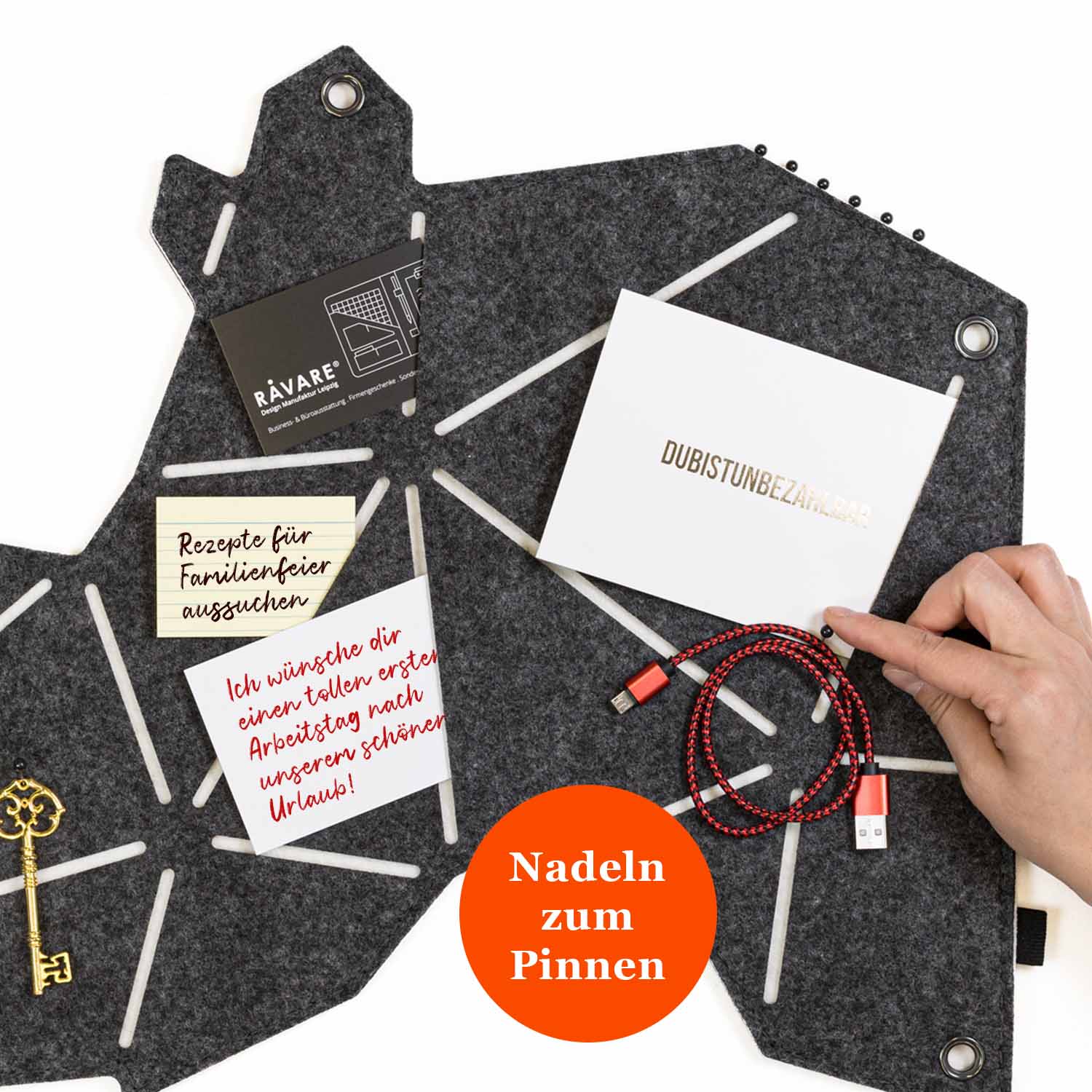 Unsere Pinnwände vereinen cleveres Anpinnen und praktisches Einschieben, sodass deine Notizen, Fotos und Karten immer sichtbar bleiben.