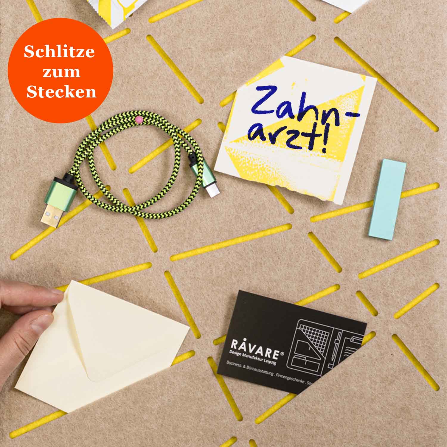 In die Schlitze lassen sich kleine Dinge wie Gutscheine, Einladungen oder Zettel einfach einschieben, während Nadeln zusätzlichen Halt für Kosmetikproben, Schultermine oder wichtige Wochen-ToDos geben.