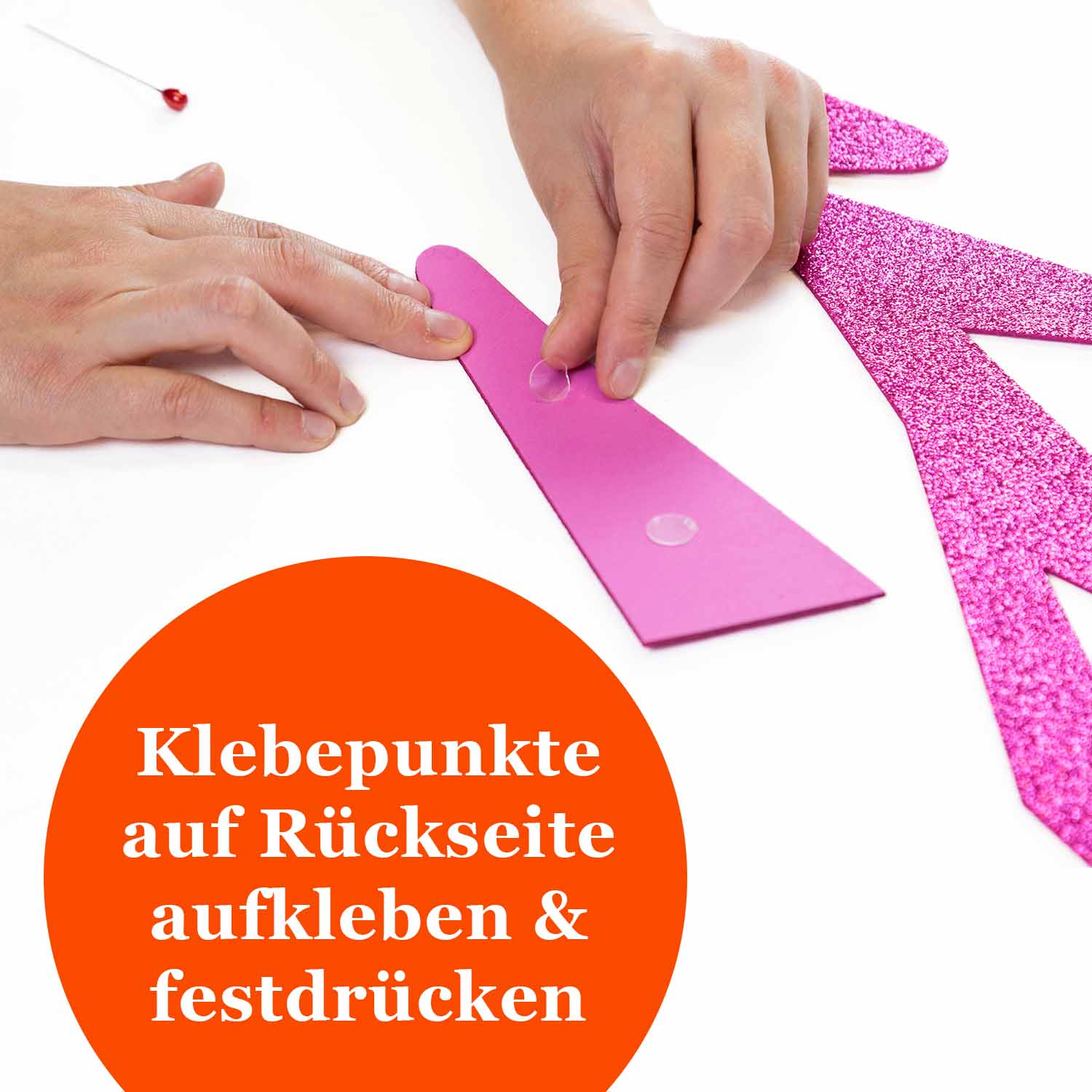 Horn und Mähne bestehen aus Glitzer-Moosgummi und werden mit den beiliegenden transparenten Klebepunkten an die Wand angebracht und können rückstandsfrei wieder entfernt werden.