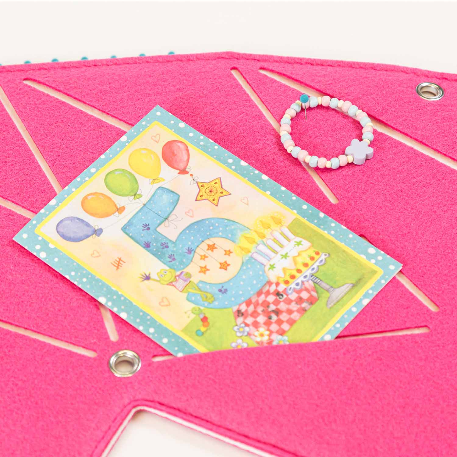 In die Schlitze lassen sich kleine Dinge wie Gutscheine, Einladungen oder Zettel einfach einschieben, während Nadeln zusätzlichen Halt für Kosmetikproben, Schultermine oder wichtige Wochen-ToDos geben.