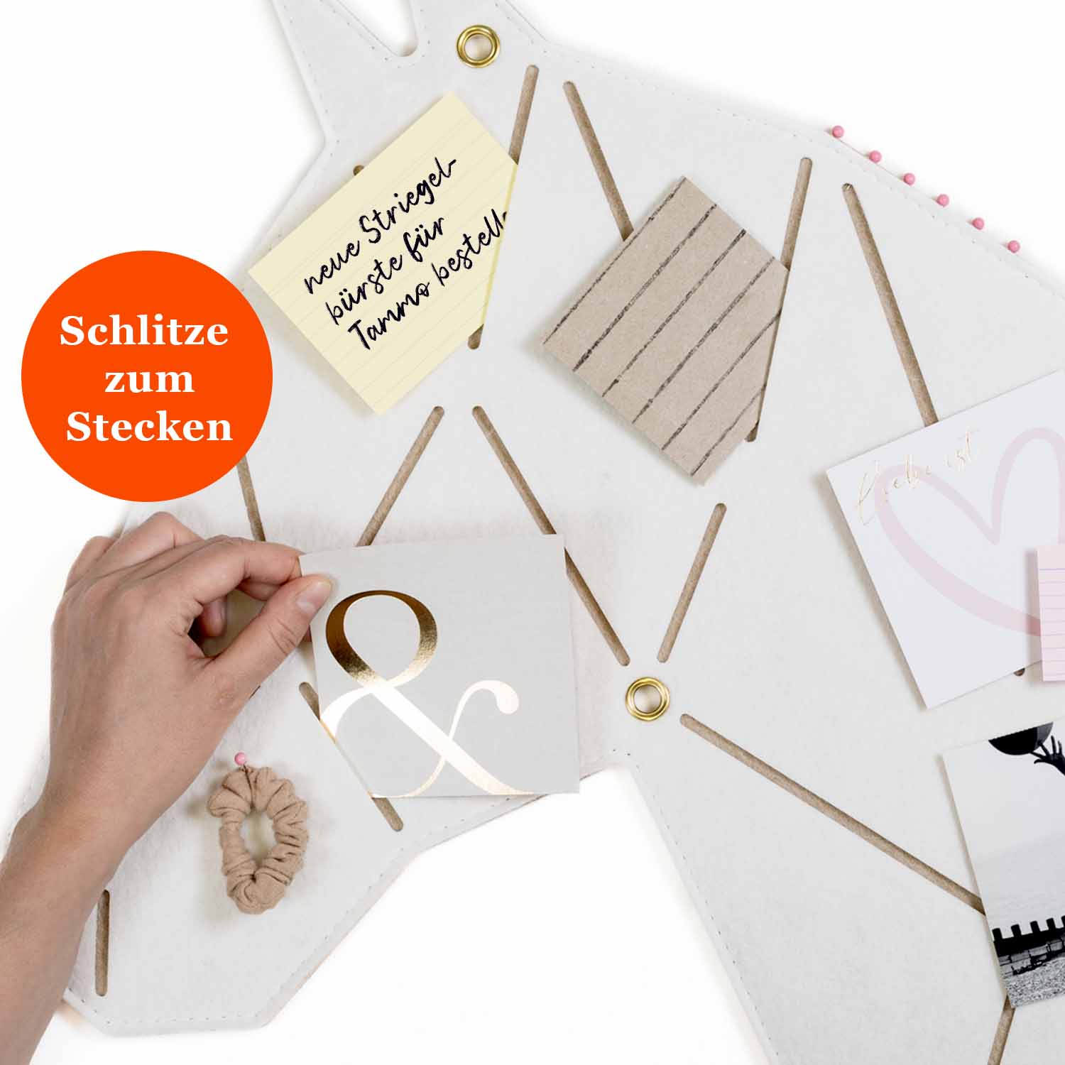 Das tierische Visionboard eignet sich außerdem hervorragend, um temporäre Gegenstände oder Dinge, die noch keinen festen Platz haben zu bündeln, wie z.B. Rabattcodes, Festivalbändchen, Schlüssel, Kosmetikproben, Schultermine oder wichtige Wochen-ToDos. Die Schlitze laden zum Einschieben ein und mit den Nadeln kannst du zusätzliche Zettelchen anpinnen.