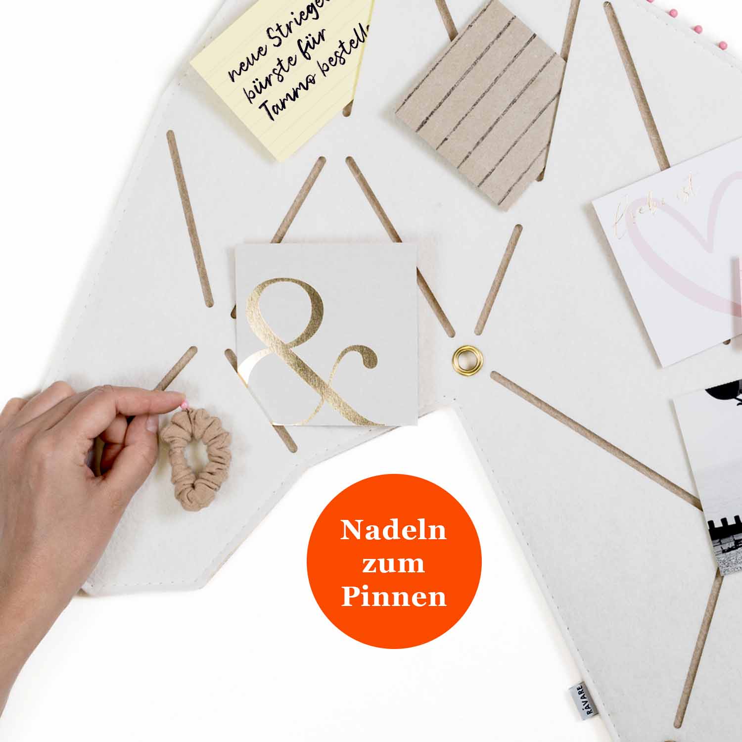 In die Schlitze lassen sich kleine Dinge wie Gutscheine, Einladungen oder Zettel einfach einschieben, während Nadeln zusätzlichen Halt für Kosmetikproben, Schultermine oder wichtige Wochen-ToDos geben.