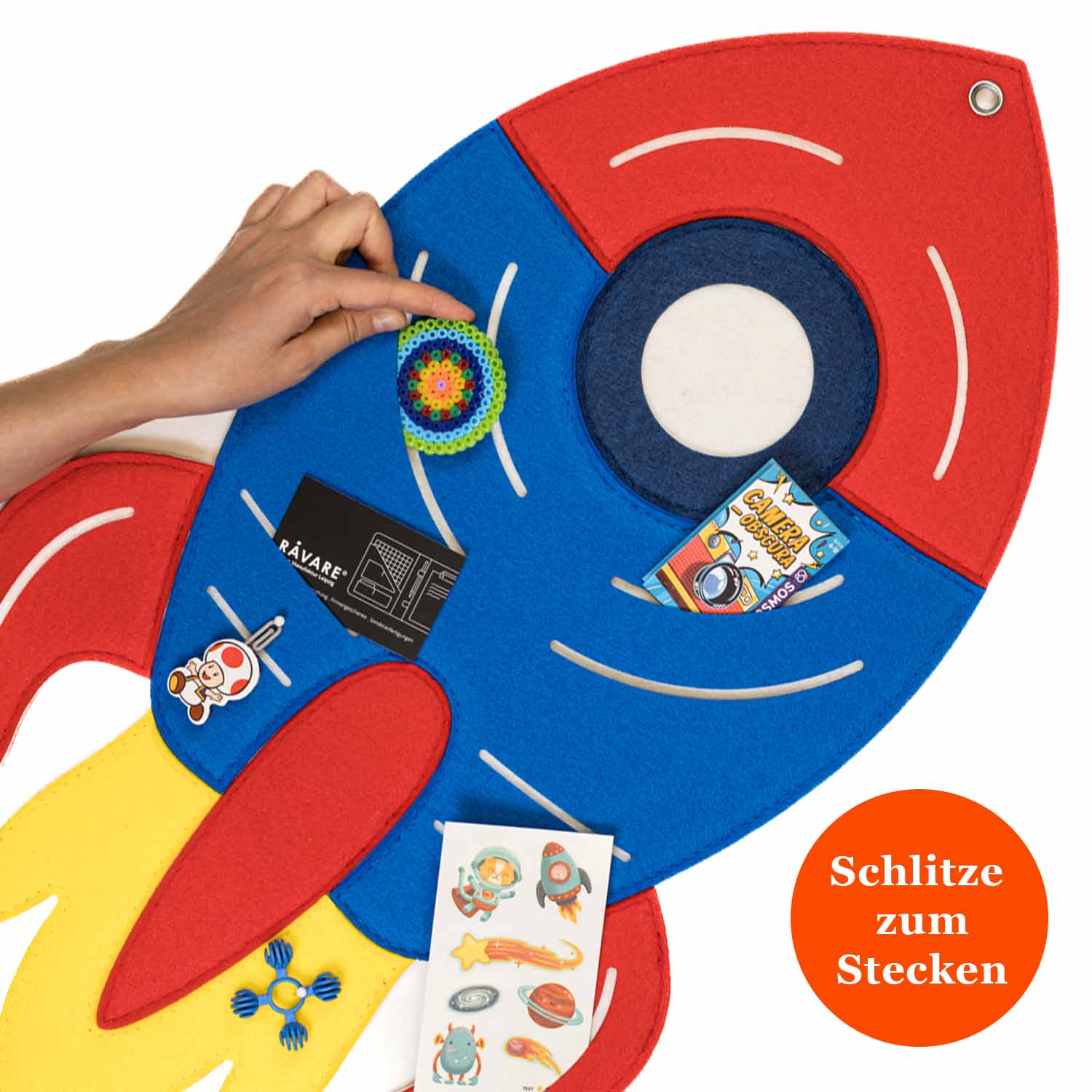 Das RAKETEN-Visionboard eignet sich außerdem hervorragend, um vorübergehend Gegenstände, die noch keinen festen Platz haben aufzubewahren, wie z.B. Freundschaftsbändchen, Sticker, Ausmalbilder oder wichtige Wochen-ToDos. Die Schlitze laden zum Einschieben ein und mit den Nadeln kannst du zusätzliche Zettelchen anpinnen.