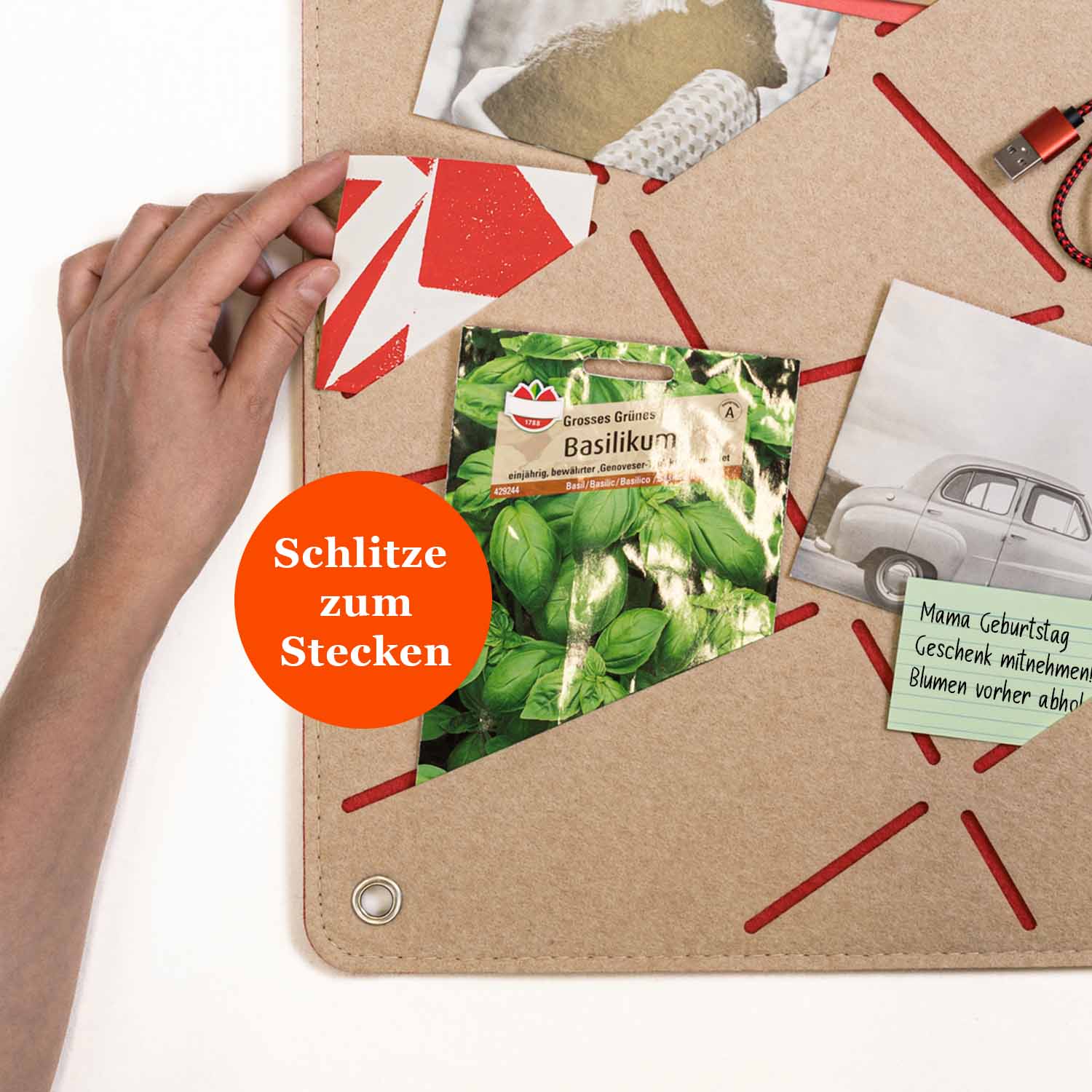 In die Schlitze lassen sich kleine Dinge wie Gutscheine, Einladungen oder Zettel einfach einschieben, während Nadeln zusätzlichen Halt für Kosmetikproben, Schultermine oder wichtige Wochen-ToDos geben.