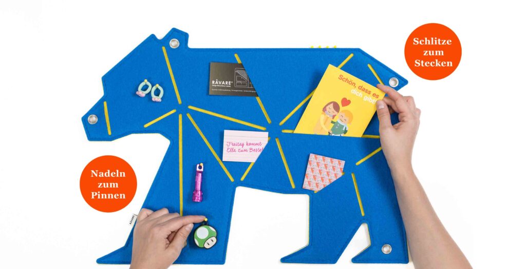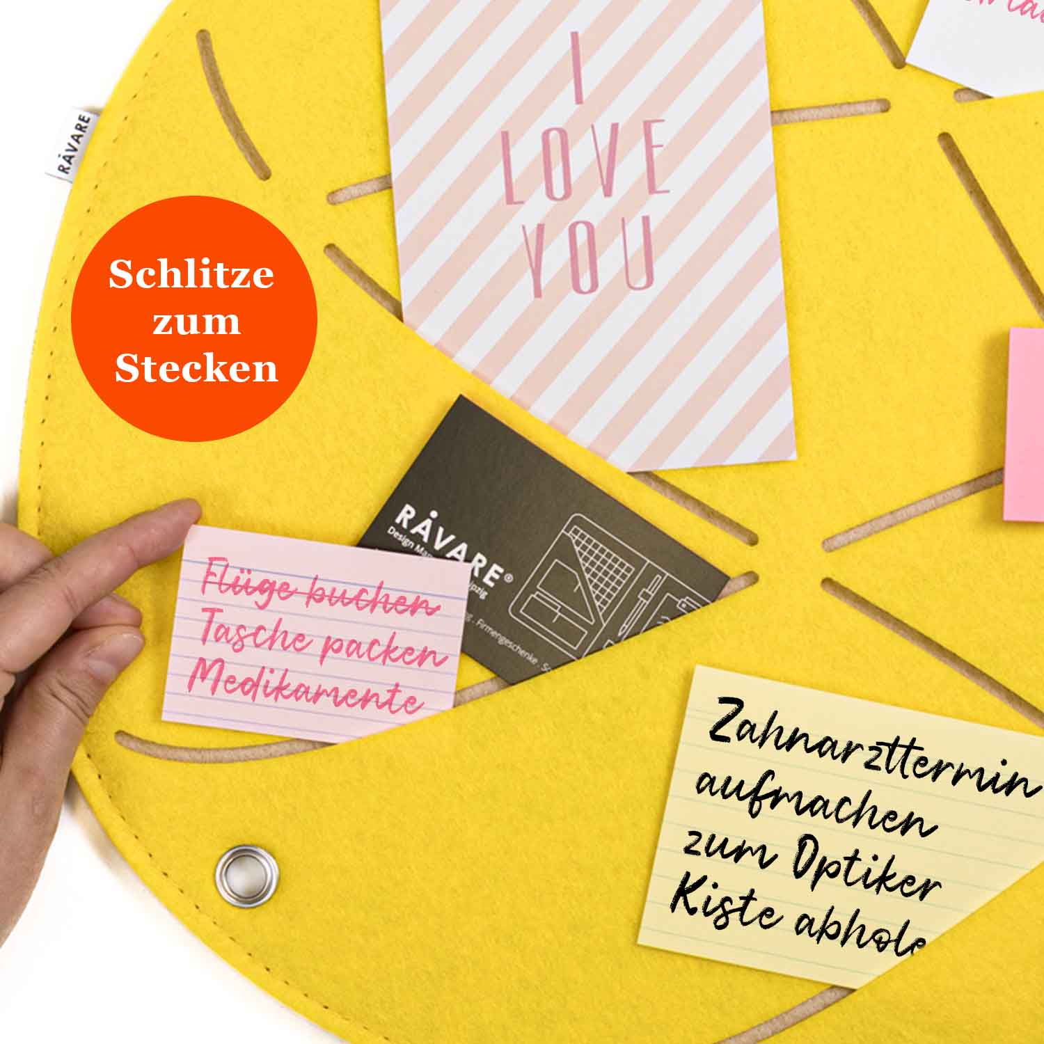 In die Schlitze lassen sich kleine Dinge wie Gutscheine, Einladungen oder Zettel einfach einschieben, während Nadeln zusätzlichen Halt für Kosmetikproben, Schultermine oder wichtige Wochen-ToDos geben.