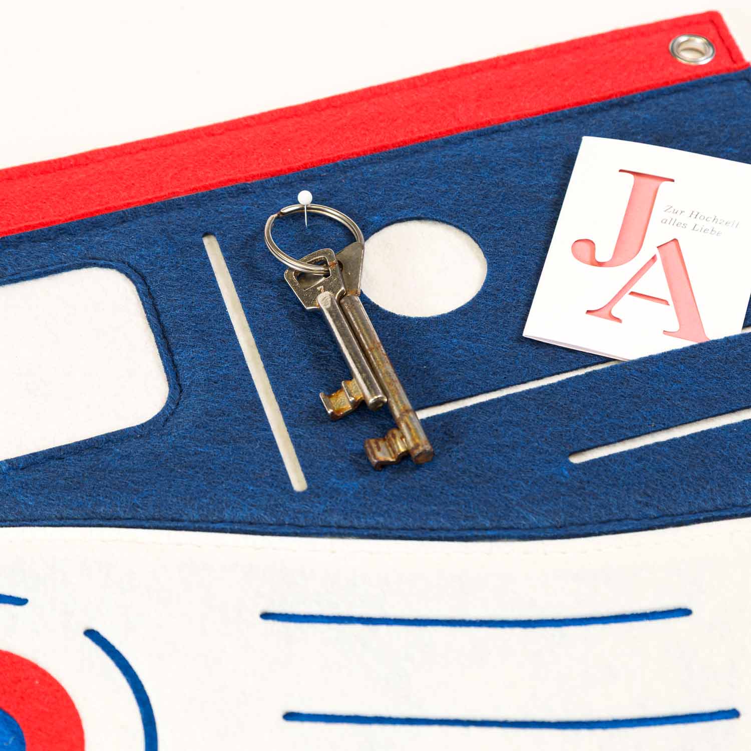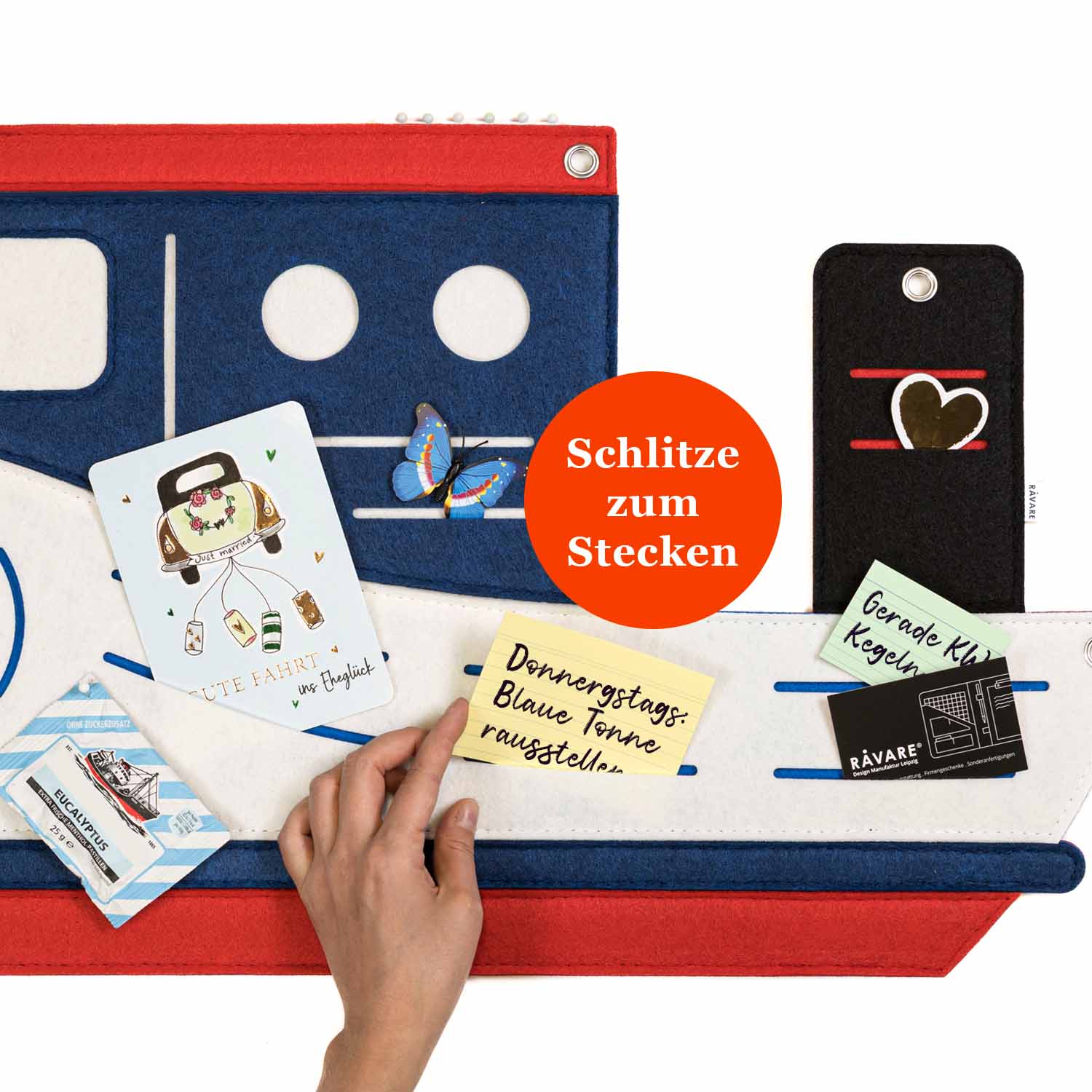 In die Schlitze lassen sich kleine Dinge wie Gutscheine, Einladungen oder Zettel einfach einschieben, während Nadeln zusätzlichen Halt für Kosmetikproben, Schultermine oder wichtige Wochen-ToDos geben.