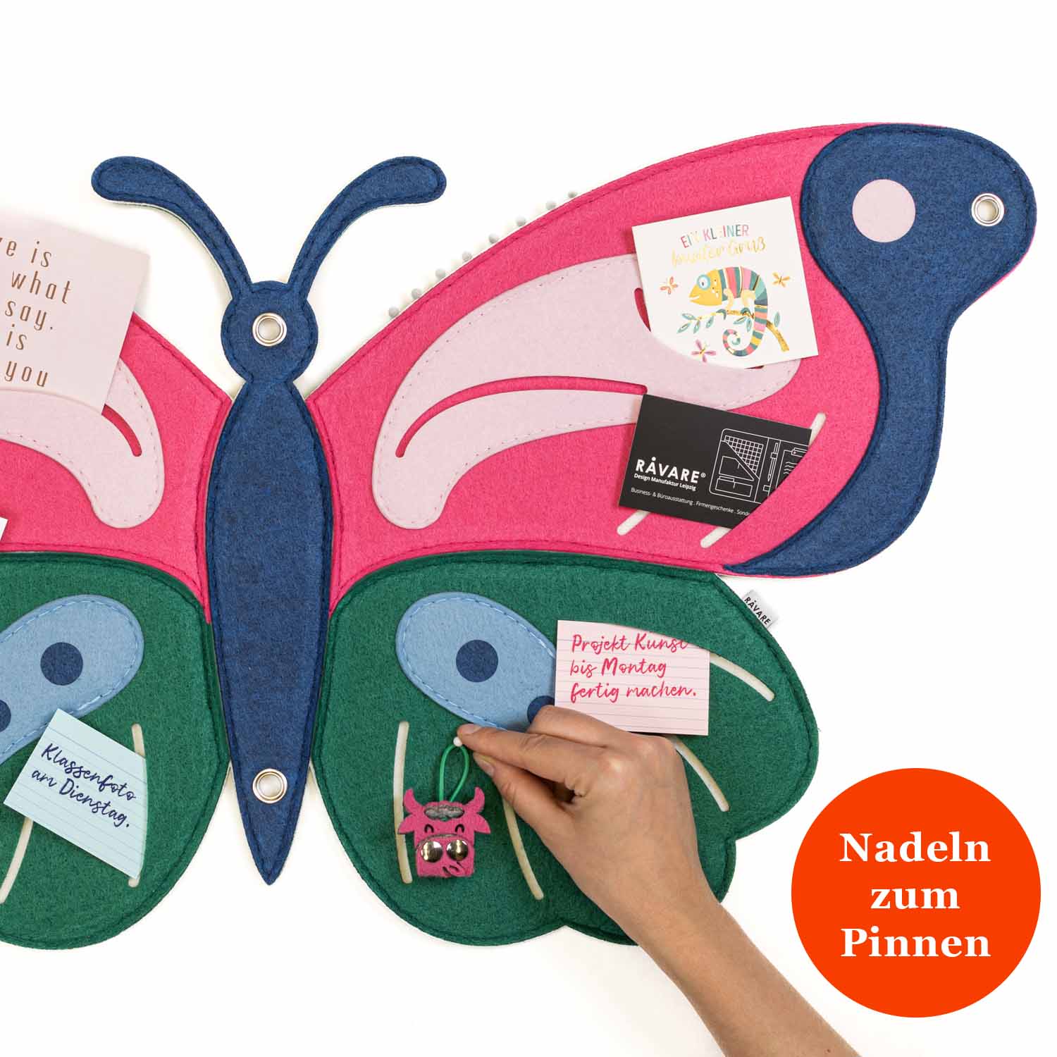 Das SCHMETTERLING-Visionboard eignet sich außerdem hervorragend, um vorübergehend Gegenstände, die noch keinen festen Platz haben aufzubewahren, wie z.B. Freundschaftsbändchen, Sticker, Ausmalbilder oder wichtige Wochen-ToDos. Die Schlitze laden zum Einschieben ein und mit den Nadeln kannst du zusätzliche Zettelchen anpinnen.